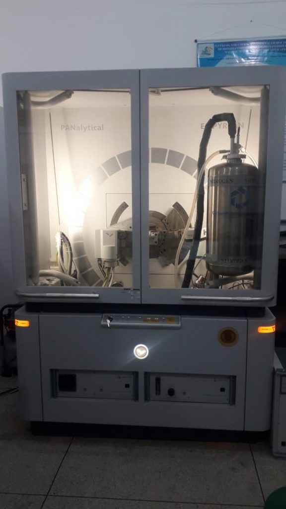 Descrição: Este equipamento é um difratômetro de raios X com geometria Bragg-Brentano para amostras policristalinas sob a forma de pó. O goniômetro vertical apresenta geometria θ-θ, raio de 240 mm, faixa angular de -111°< 2θ < 168°, linearidade de 2θ (±0,01°), resolução angular: 0,026° e menor passo possível de 0,0001°. A radiação utilizada são as linhas Kα1/Kα2 do cobre (λ = 1,540598/1,544426Å). A tensão e corrente de operação do tubo de raios X são 40 kV e 40 mA, respectivamente. O sistema conta com fendas Soller primária e secundária de 2,5º, de divergência de 0,6º, filtro de níquel para eliminar outros comprimentos de onda, monocromador de grafite pirolítico e câmara de temperatura Anton-Paar modelo TTK 450.