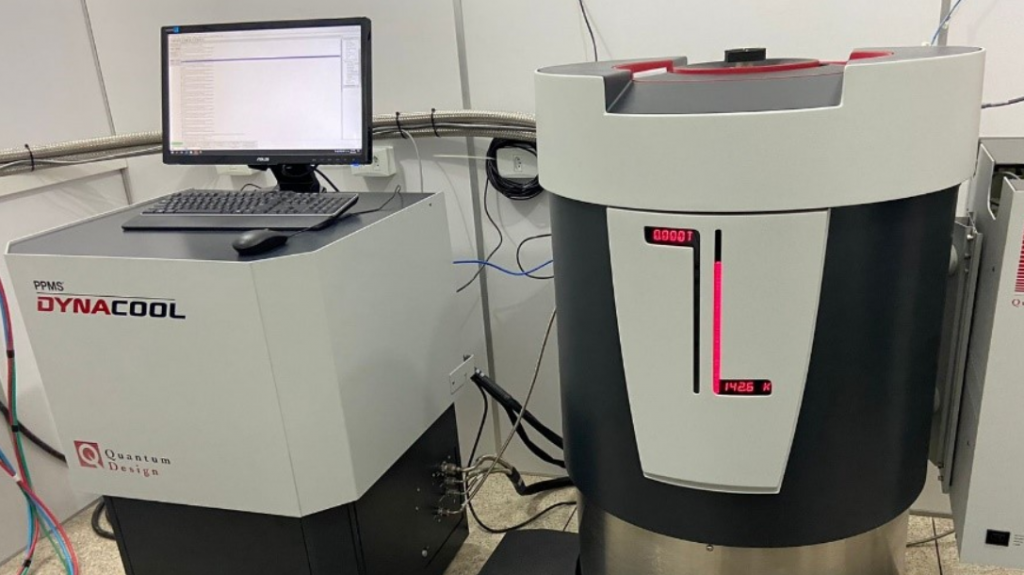 Descrição: Descrição: Nossa infraestrutura conta com um PPMS modelo Dynacool 9T, fabricado pela Quantun Design Inc. Este equipamento está equipado com os sistemas de medidas de calor específico e medida de resistividade elétrica. Permite realizar medidas em função da temperatura em uma ampla região, desde temperaturas criogênicas (1,8 K) até temperaturas acima do ambiente (400 K). Simultaneamente ele permite aplicação de campo magnético altamente homogêneo na região da amostra, que pode ser variado entre zero e 9 Teslas. Este equipamento apresenta alta precisão tanto na variação de temperatura como na aplicação do campo magnético. Para variação de temperatura, o PPMS utiliza um sistema de ciclo fechado para liquefação de He, e o campo magnético é produzido por uma bobina supercondutora que opera em banho de He líquido.