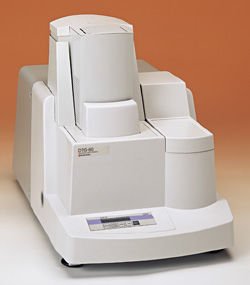 Descrição: Este analisador térmico é um calorímetro diferencial de varredura utilizado para controle de qualidade em áreas como polímeros, produtos farmacêuticos, peças eletrônicas, alimentos, etc. Possui amostrador automático embutido disponível para medir até 24 amostras automaticamente. Além disso, ao sobrepor os resultados de temperatura modulada aos resultados obtidos pelo aumento da temperatura a uma taxa constante, este instrumento pode medir o calor específico ou vários fenômenos que não podem ser separados usando sistemas DSC padrão. As medidas variam até 600 °C com faixa de detecção de vazão de calor de ±150mW em atmosfera inerte ou ar.